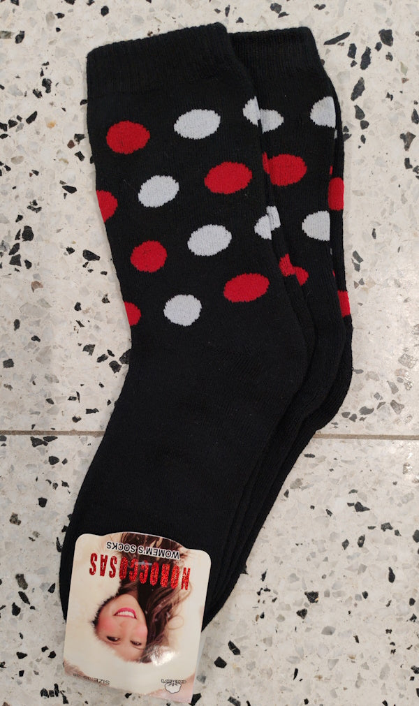 - mustat sukat valkoisilla ja punaisilla palloilla